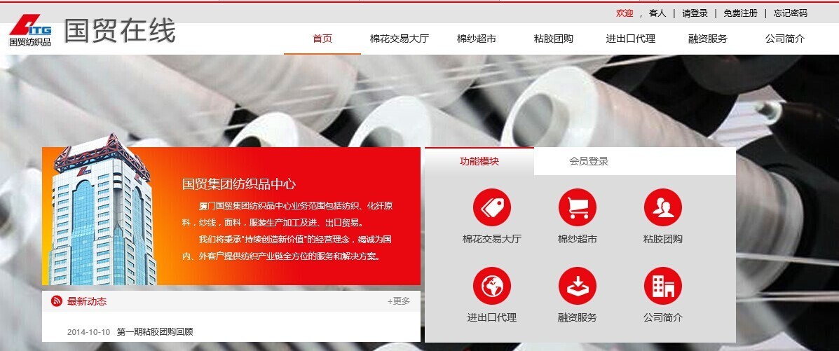 “国贸在线”是国贸纺织品中心整合线下纺织产业链的电子商务平台,为众多客户提供棉花到棉纱、粘胶以及纺织品进出口代理、棉花融资等服务,设置棉花交易大厅,棉纱超市,粘胶团购、进出口代理,棉花融资等栏目,吸引国内纺织产业链客户,通过全新的“国贸在线”商务平台,开展真实、安全、高效、便捷的网上贸易,感受友好、贴心、全流程服务的用户体验。