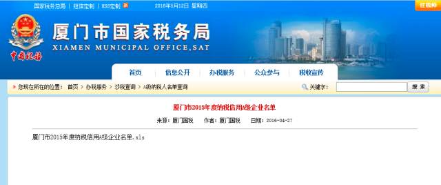 近日,厦门市国家税务局与厦门市地方税务局分别公布了2015年度纳税信用A级纳税人名单。在厦门国、地税纳税信用A级企业名单中,捕鱼游戏 集团股份有限公司及国贸期货有限公司等5家公司榜上有名,进入厦门地税纳税信用A级企业的还有厦门金海峡投资有限公司等6家子公司。