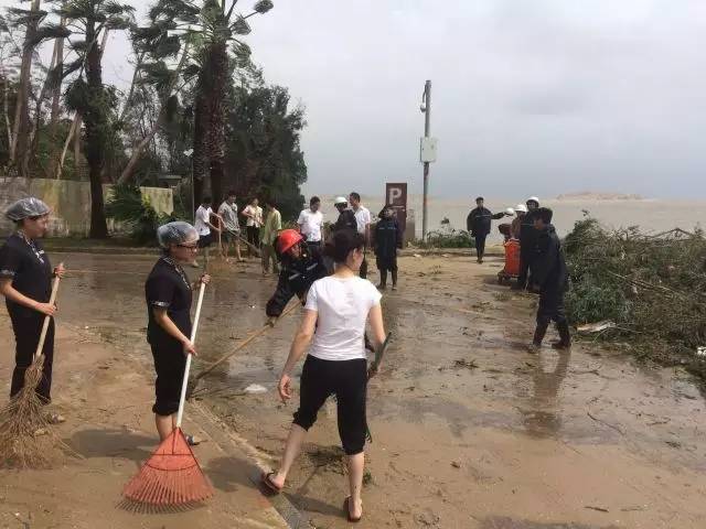 金门湾酒店位处台风登陆点,当晚全体管理人员留守酒店值班,处理渗水,加固门窗。台风登陆后,又忙于周边环境的清理和受损发电机的维修。家住酒店附近此次台风登陆点欧厝村的员工连家都没有回,几天来一直奋战在抗台救灾的现场。