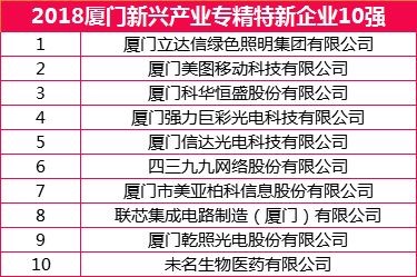 在同时发布的“2018厦门新兴产业专精特新企业10强” 排行榜中,信达股份公司旗下厦门信达光电科技有限公司上榜。